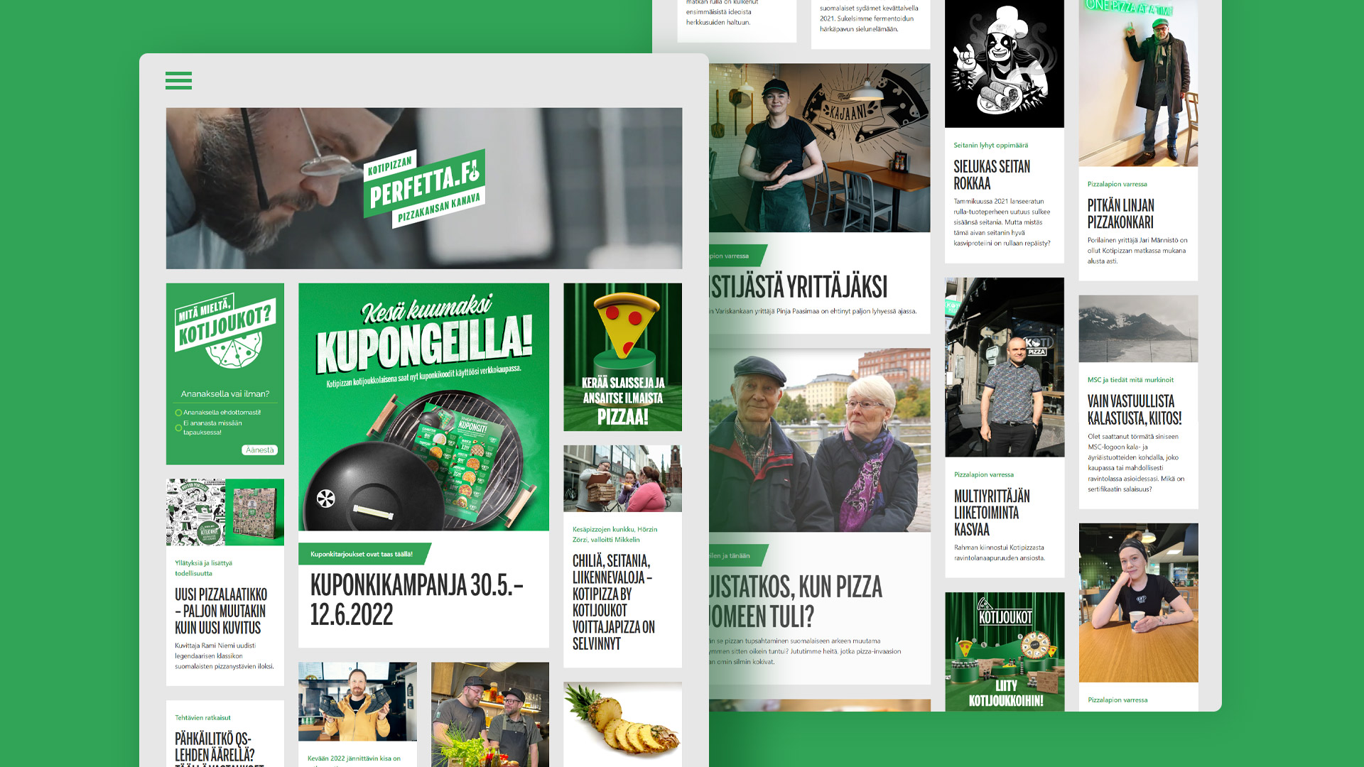 Yhdessä Kotipizzan idearikkaan sisältömarkkinointitiimin kanssa ideoimme uudenlaisen sisältökanavan, joka tarjoaa kuluttajalle houkuttelavan tavan tutustua Kotipizzan tarjoamiin sisältöihin sekä samalla mahdollisuuden tutustua kotimaiseen pizzakulttuuriin ja henkilöihin toiminnan takana.