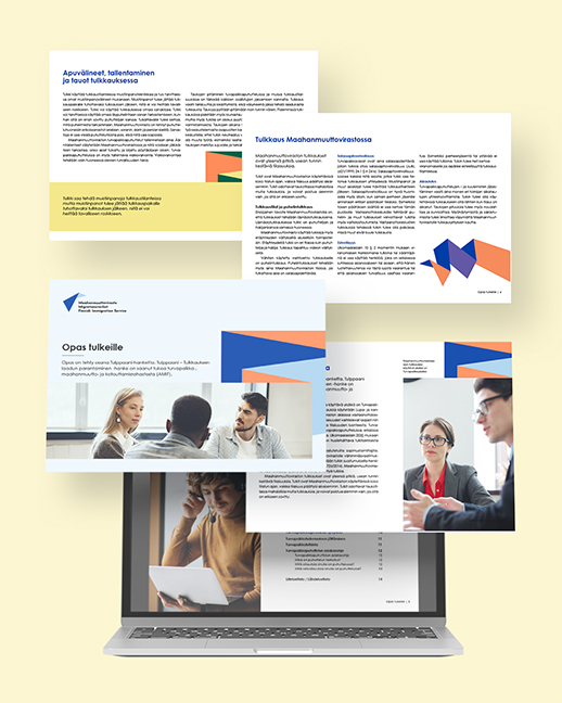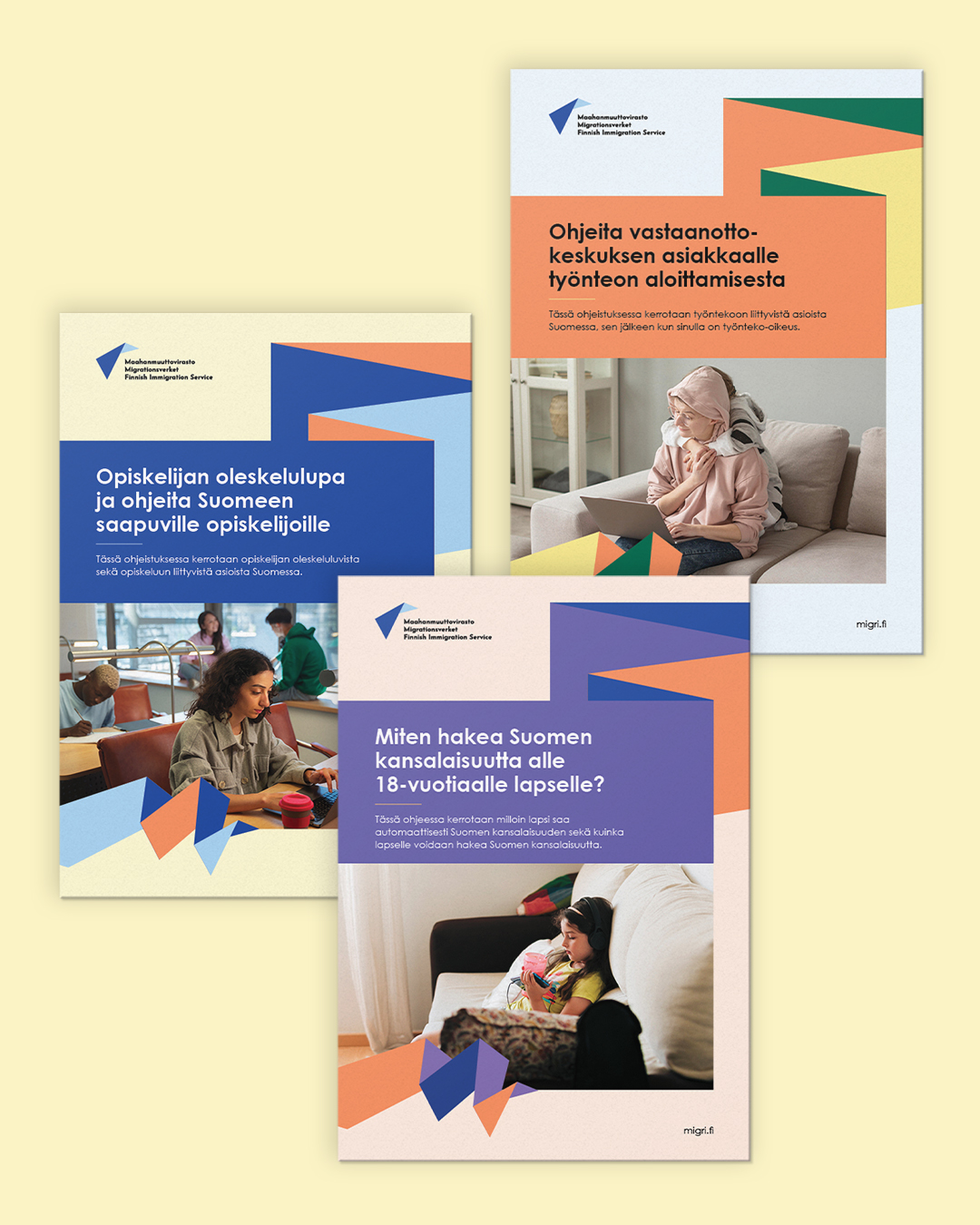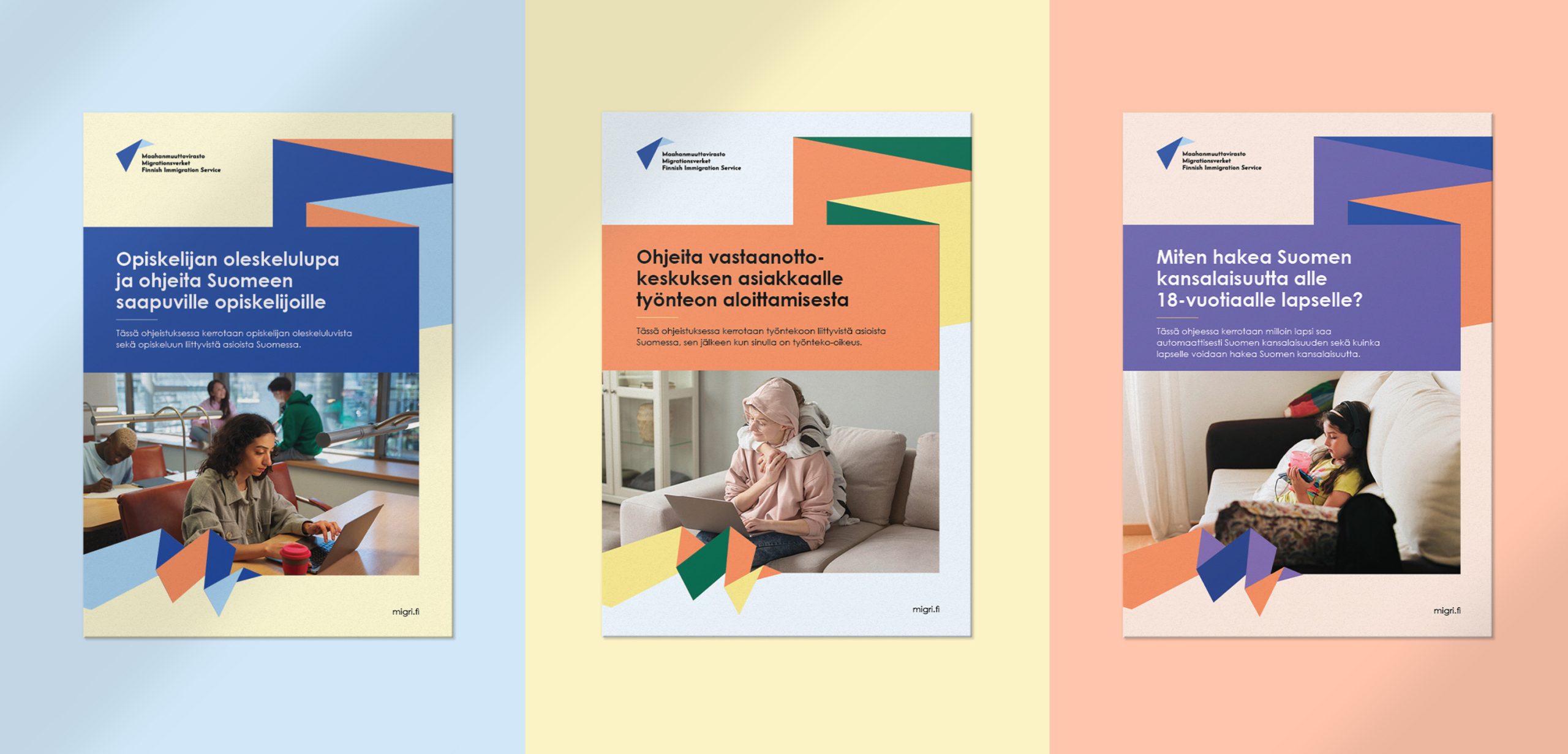 Päivitimme värimaailmaa saavuttevammaksi kaikkien muiden värien osalta paitsi Migrin tummansininen jäi entiselleen. Väripalettiin jäivät käytetyimmät värit päivitettyinä versioina eli vaalean sininen, vihreä ja keltainen sekä uusina väreinä palettiin lisättiin oranssi ja violetti. Punainen jäi käyttöön vain huomiovärinä. Uusissa graafisissa elementissä on huomioitu niin Migrin tunnuksen ja käyttöön jäävien elementtien muotokieli kuin M-kirjain kolmessa eri värivaatiossa. Uudet värit ja elementit otettiin heti käyttöön Maahanmuuttoviraston uusissa toteuttamissamme asiakirja- ja powerpoint-esityspohjissa. Materiaalien rikkaamman värimaailman ja monipuolisen käyttötarkoitusten takaamiseksi toteutimme pohjista useampia eri väri- sekä sommitteluvariaatioita.